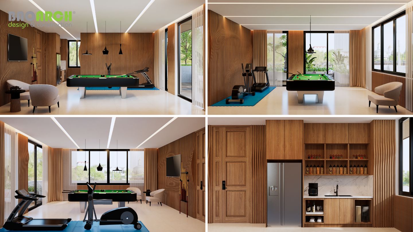 Tầng trệt mở ra không gian tiếp khách và hồ cá thư giãn, mang đến cảm giác đón chào đầy gần gũi. Các tầng lầu trên là nơi bố trí hệ thống phòng ngủ, phòng làm việc, thư viện, phòng giải trí và phòng trẻ em – tất cả đều mang phong cách hiện đại, sử dụng chất liệu cao cấp như gỗ tự nhiên, kính và đá marble.