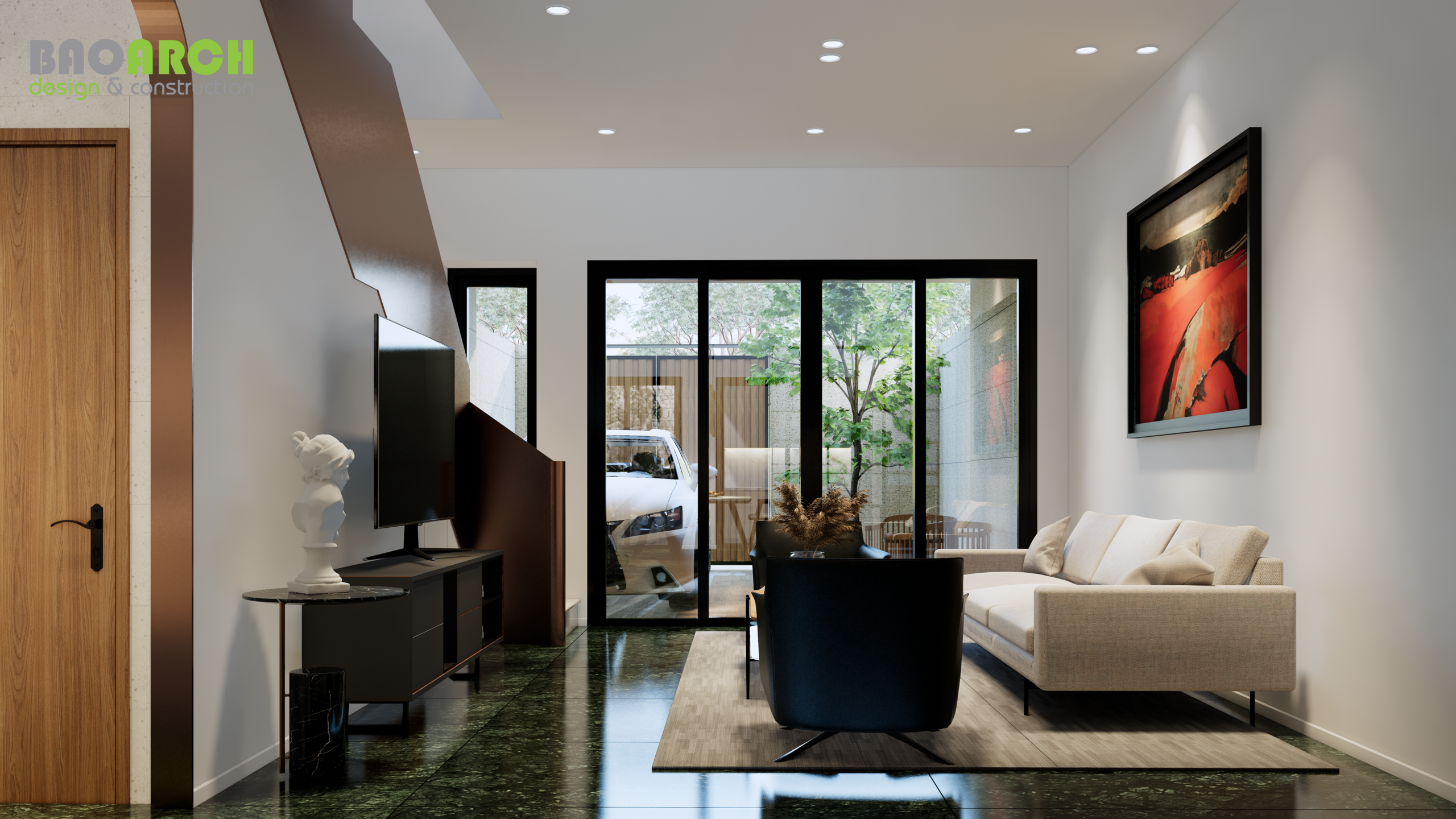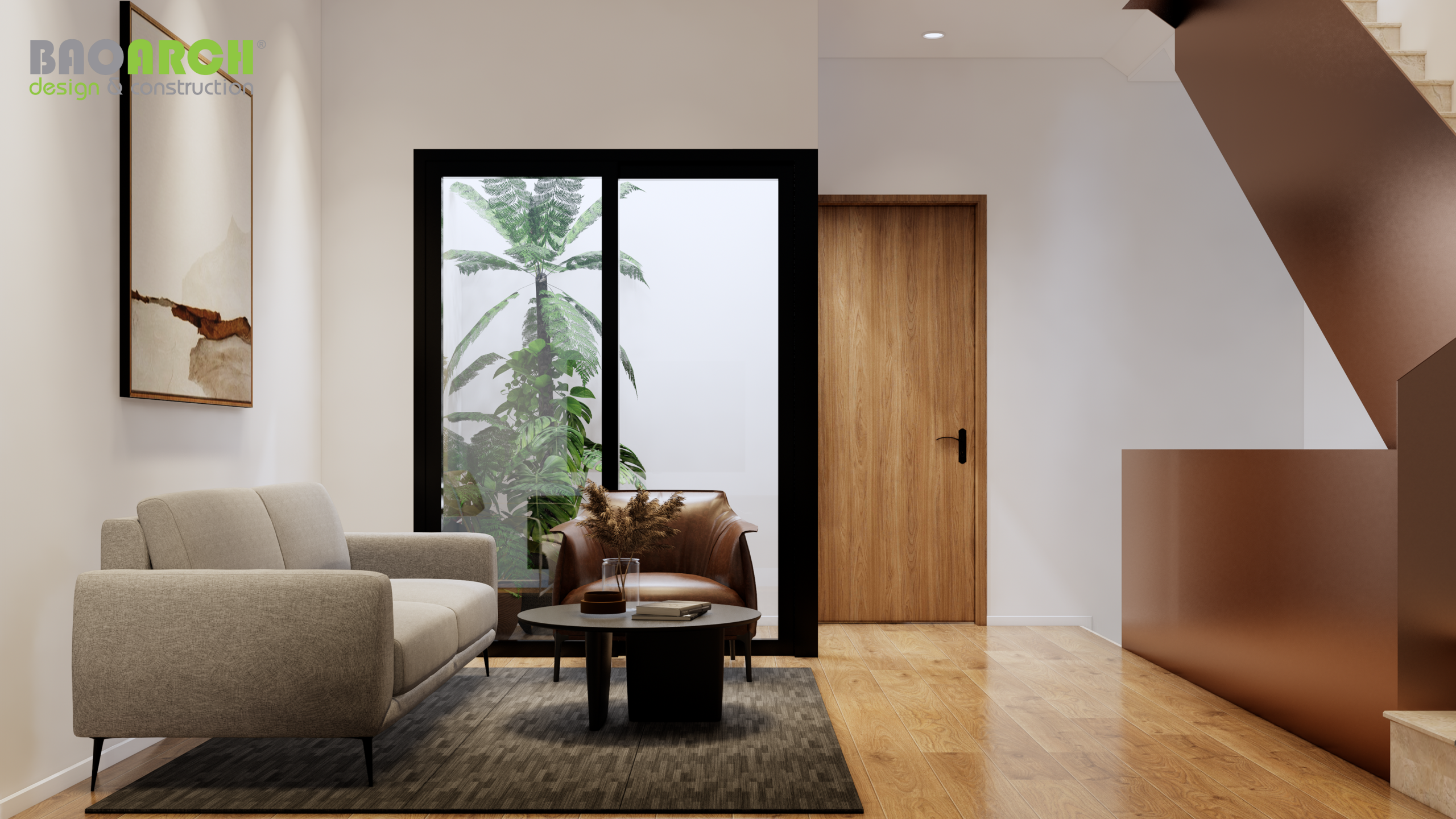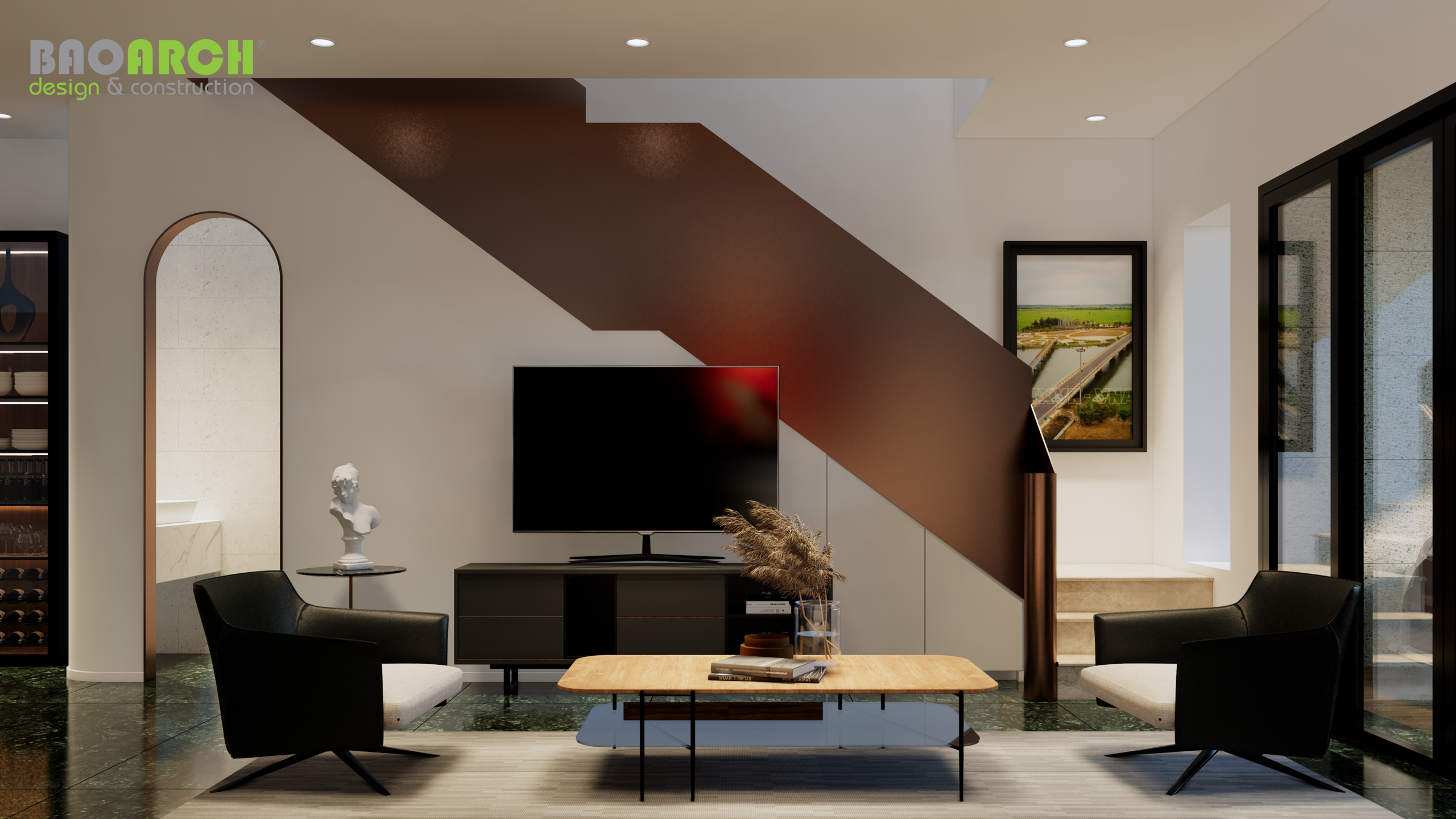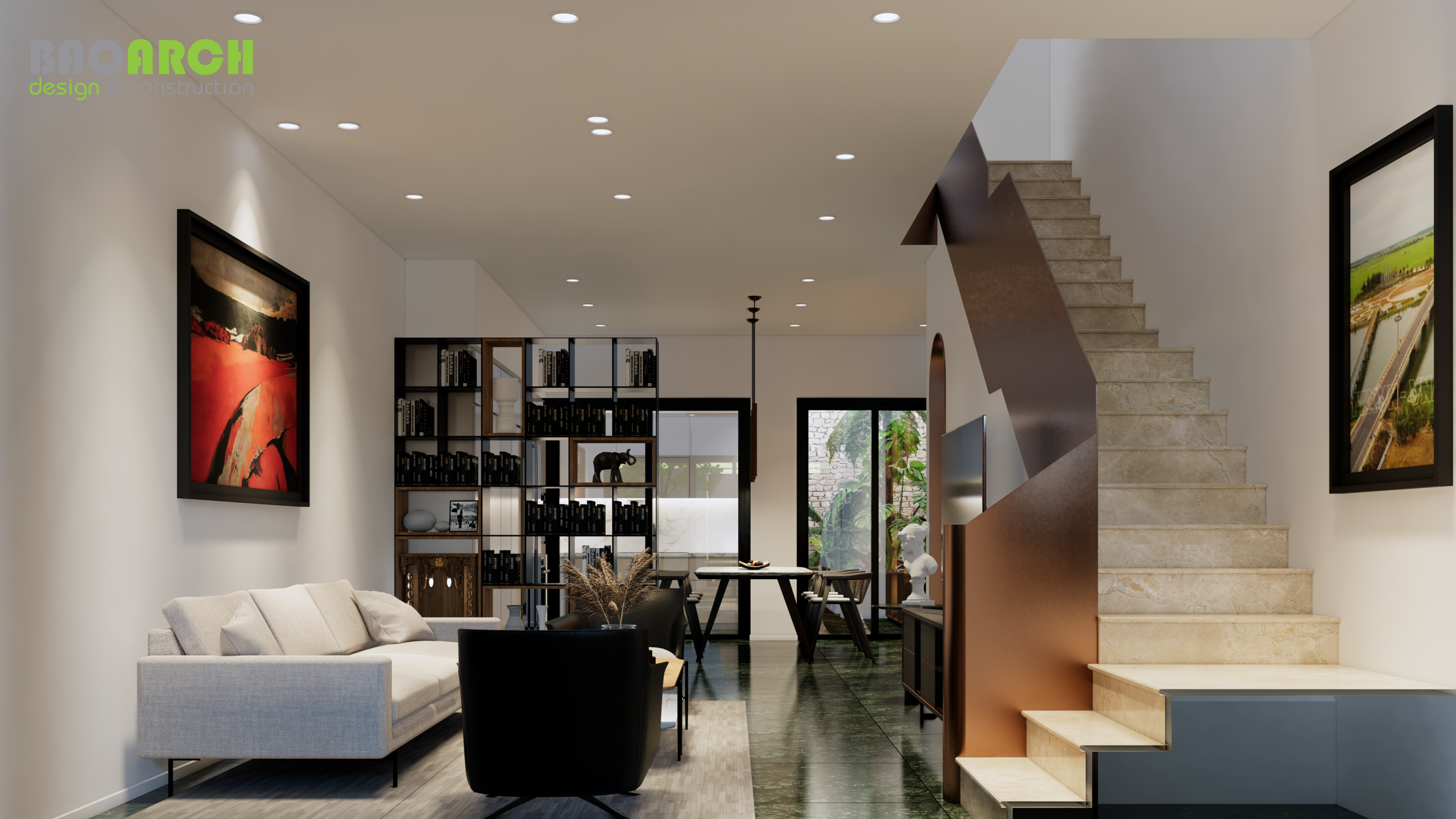 Đội ngũ Bảo Arrch thiết kế và hoàn thiện nội thất theo phong cách hiện đại và tối giản. Không gian nội thất được tối ưu hóa để tạo ra một không gian sống đa năng và tiện nghi cho gia đình chủ nhà.